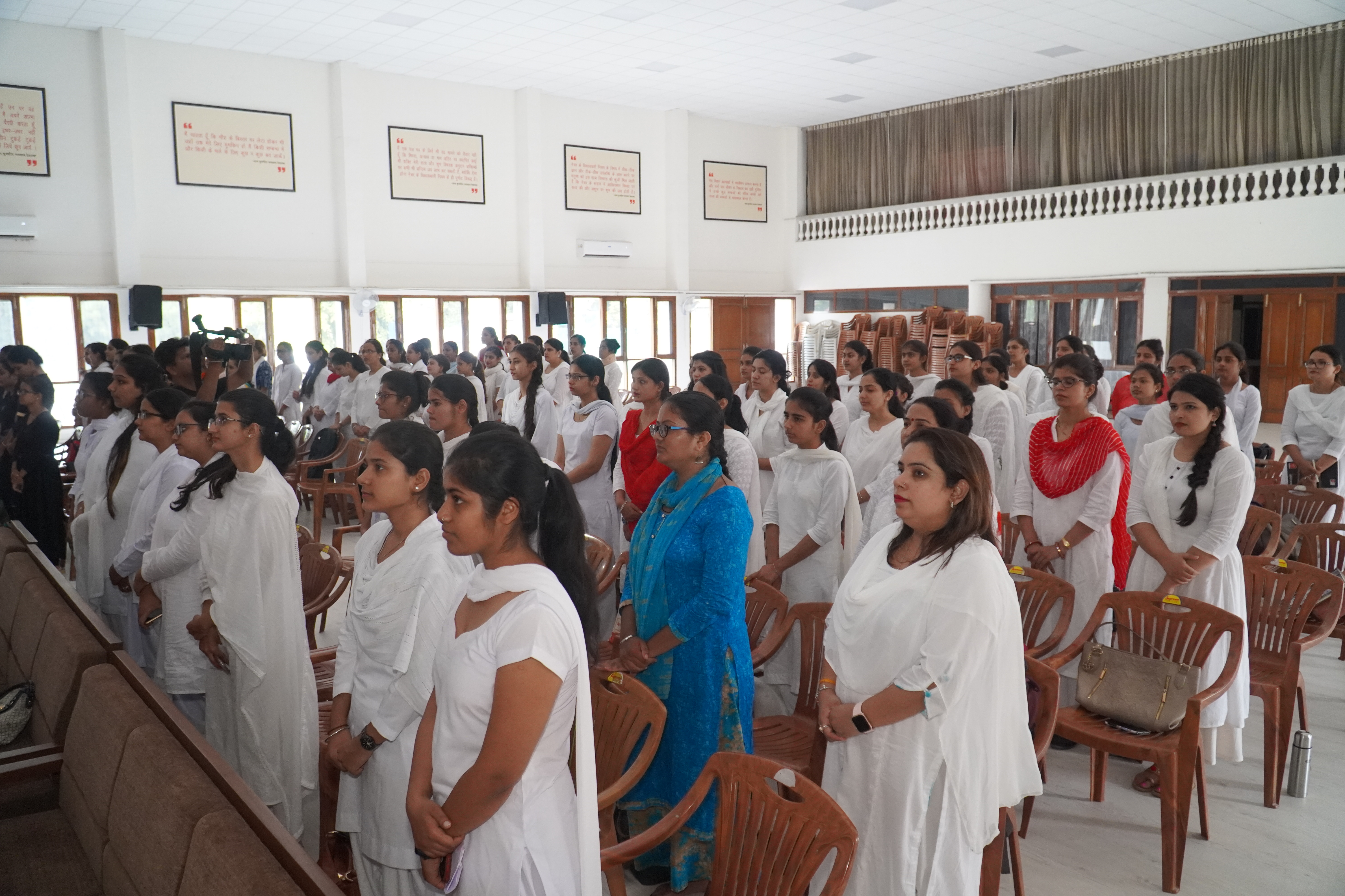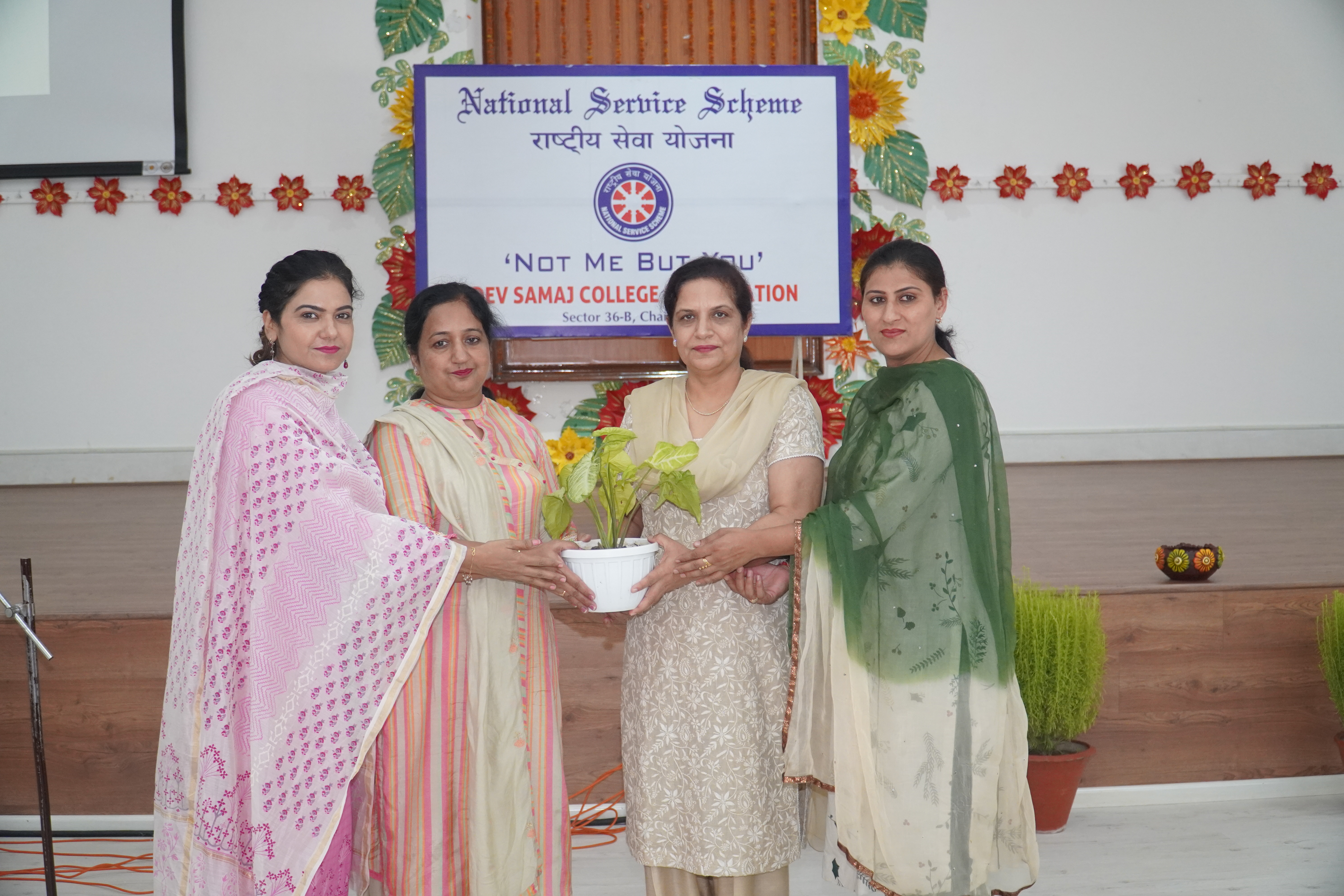 NSS units of Dev Samaj College, Sector 36-B, Chandigarh celebrated NSS Day on 24th September, 2019. The chief guest of the event was Ms. Navdeep Sharma, NSS Co-ordinator , Panjab University, Chandigarh. The celebration began with the college prayer " Mubarak Ho" which was further followed by the NSS Anthem "Uthein Samaj ke liye". Dr (Mrs) Agnese Dhillon welcomed the chief guest and presented a Sapling as a part of the tradition of the college. The function highlighted the significance of the National Service Scheme, a Central Sector Scheme of Government of India, Ministry of Youth Affairs and Sports. Dr. Neeru Malik enlightened the students about NSS and its activities carried out by NSS Volunteers in 2016 till now, through a power point presentation. Speech was given and Poems were recited by the students in lieu of the event. A skit on the theme of “Plastic Free Chandigarh” was also performed. The event proceeded with the prize distribution ceremony for the active participation of students in various NSS activities conducted by the college. Vote of Thanks was given by Dr. (Mrs) Harpreet Kaur, NSS Co-ordinator,Dev Samaj College of Education. The event concluded with the National Anthem.